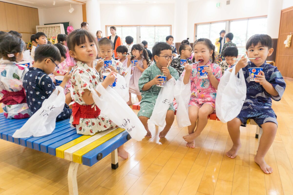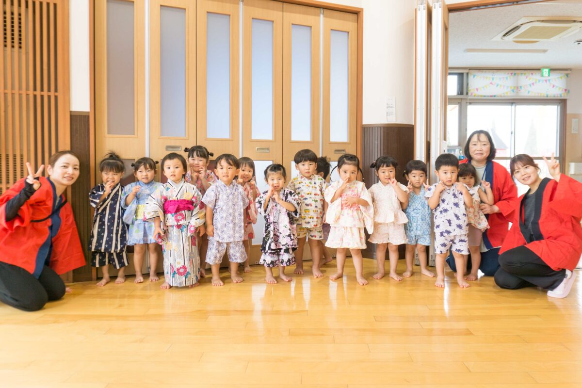 当日は、甚平や浴衣姿で登園してくれた子どもたちがたくさん!色とりどりの可愛い姿にお祭り気分も一層高まりました。保護者の皆様のご協力があり大成功の夏祭りでした。お忙しい中準備してくださり本当にありがとうございました。