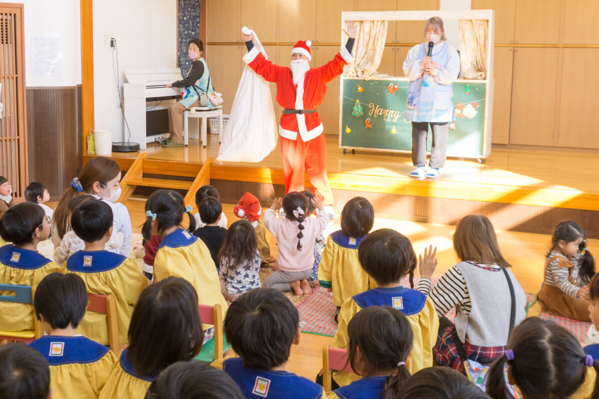 みんなで先生の出し物を楽しんでいると・・・どこからか鈴の音が聞こえてきてサンタさんが登場!子ども達は目を輝かせて喜んでいました。
